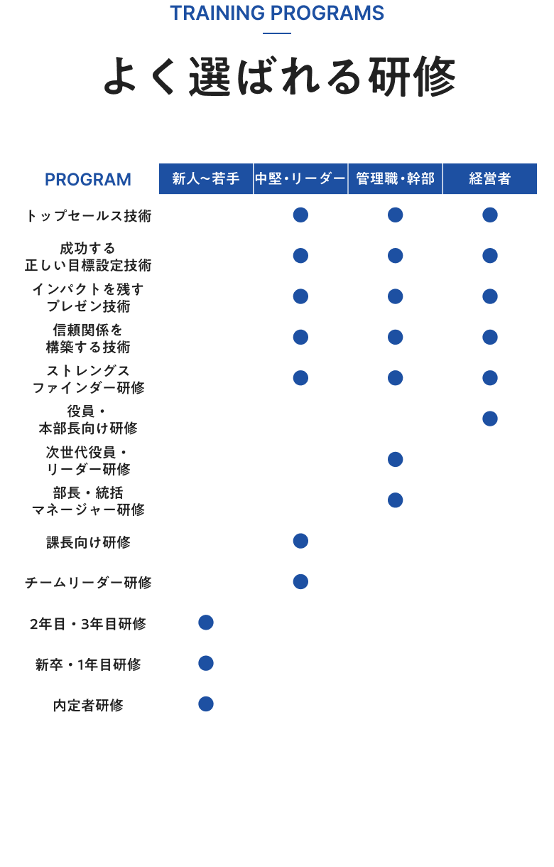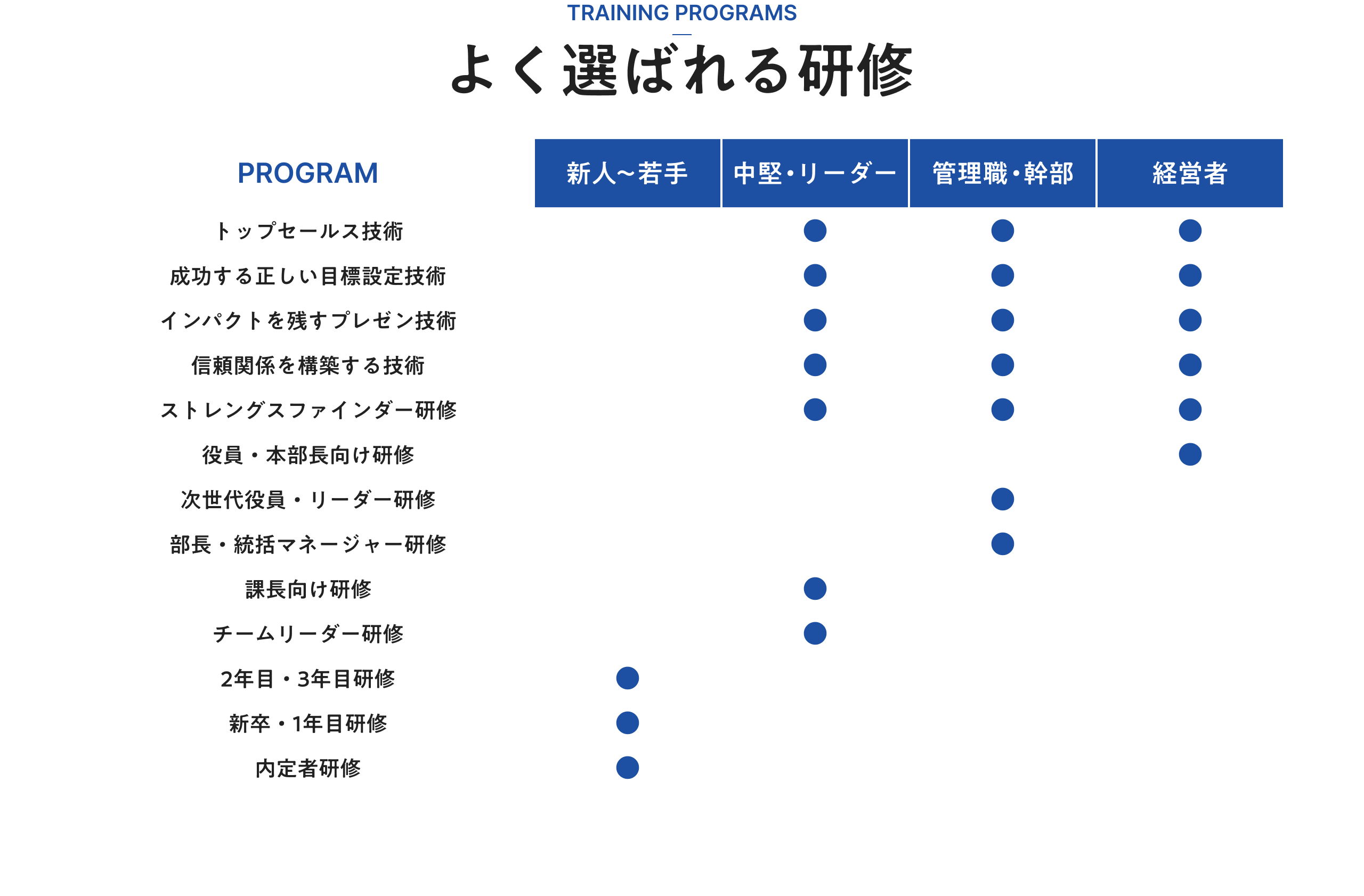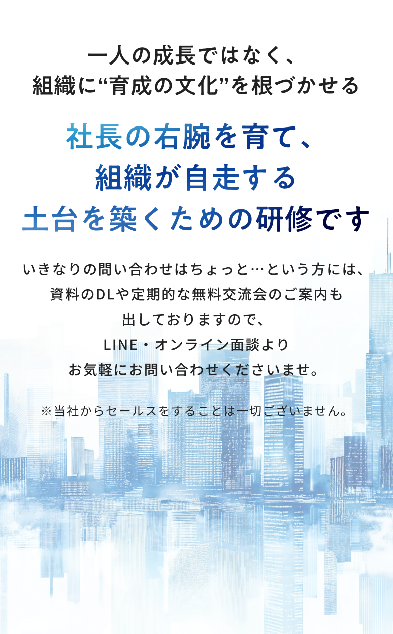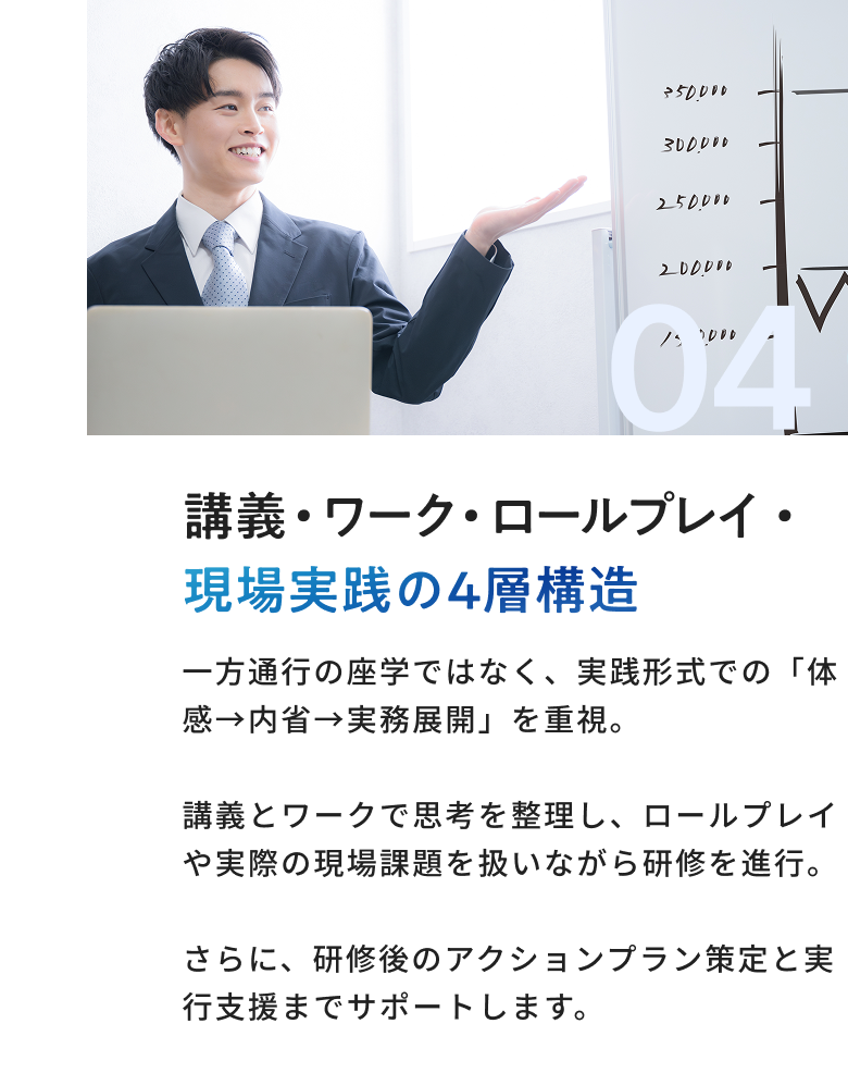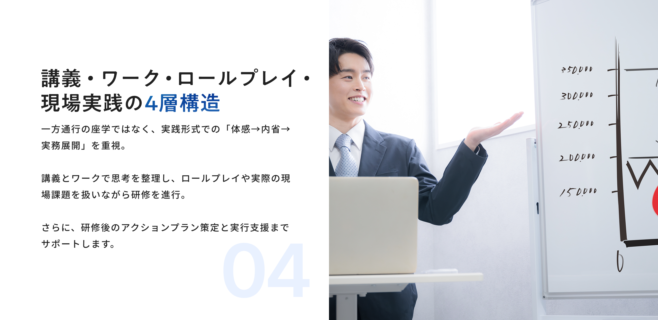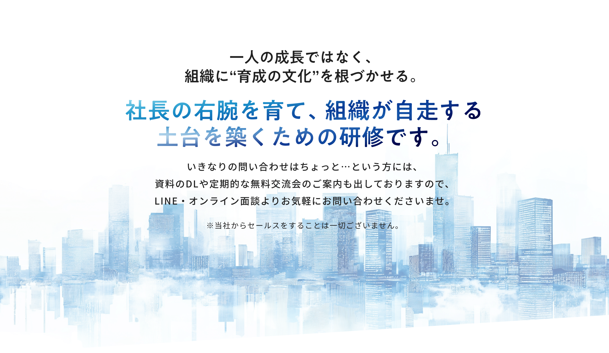 私どもの研修は、「人の心を大切にする」という信念に基づいています。人間関係の本質を核とした確かなロードマップに沿って実施し、「心の幸せと業績向上を必ず両立させる」再現性の高いメソッドをご提供します。御社の社員様一人ひとりの可能性を開花させることに全力を注ぎます。