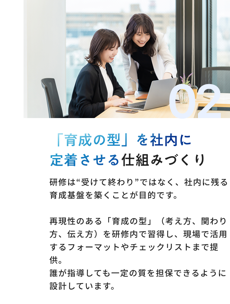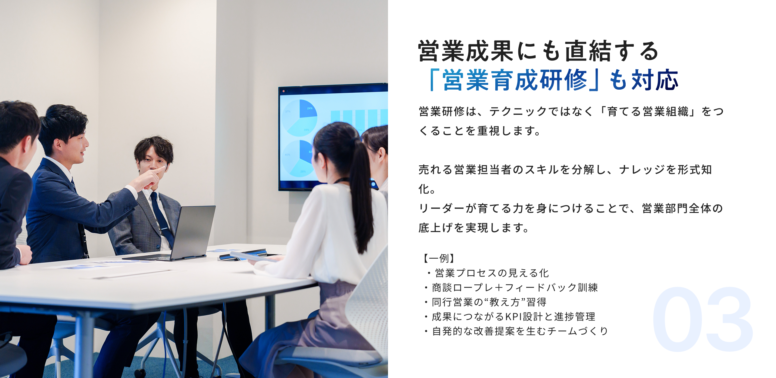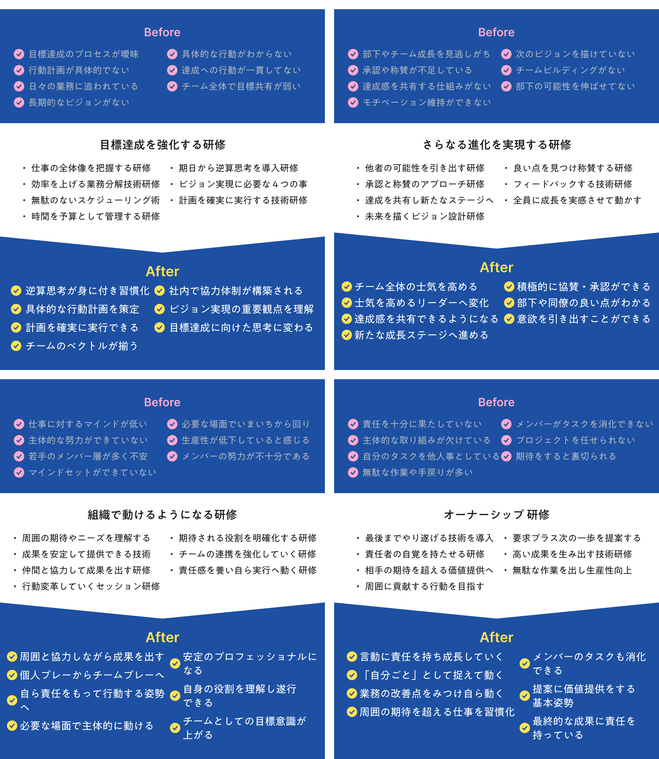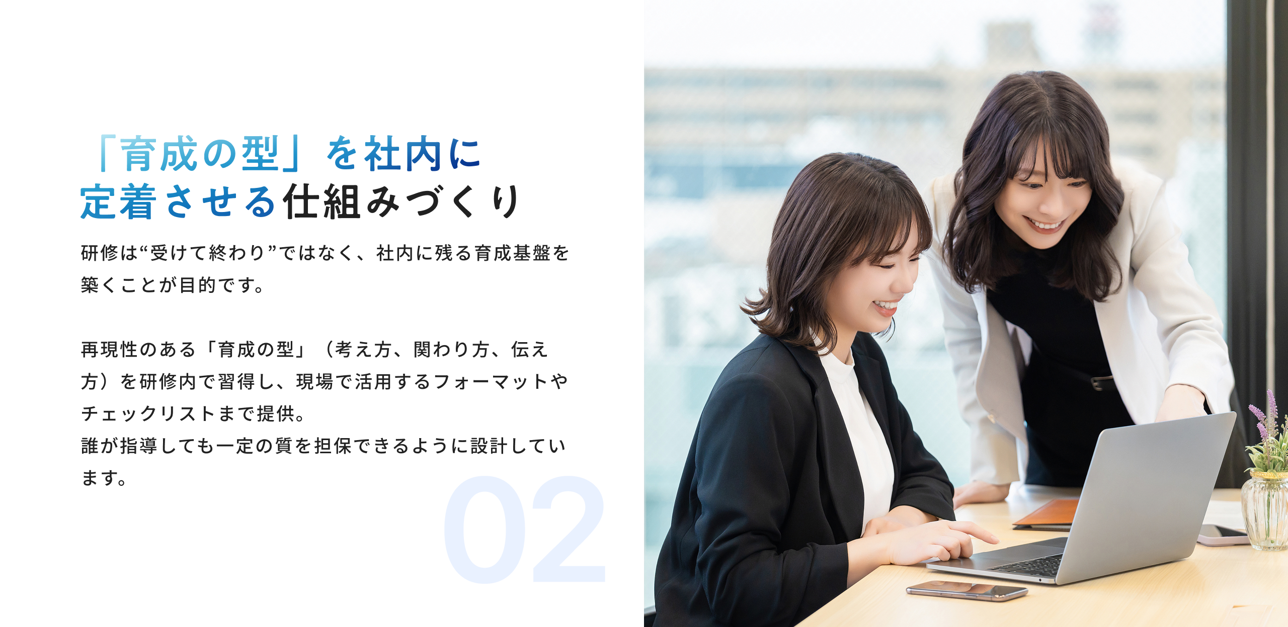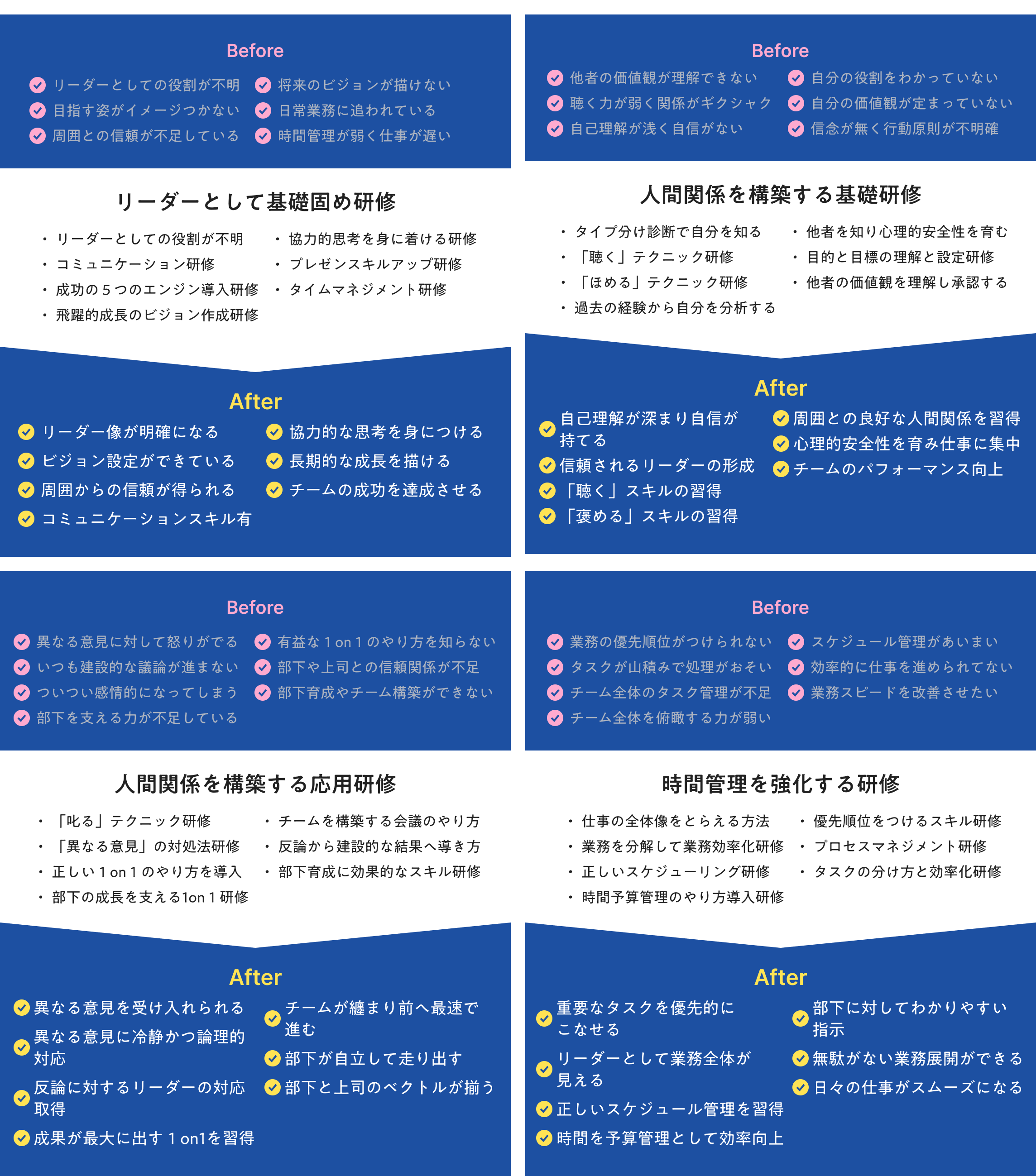 私どもの研修は、「人の心を大切にする」という信念に基づいています。人間関係の本質を核とした確かなロードマップに沿って実施し、「心の幸せと業績向上を必ず両立させる」再現性の高いメソッドをご提供します。御社の社員様一人ひとりの可能性を開花させることに全力を注ぎます。