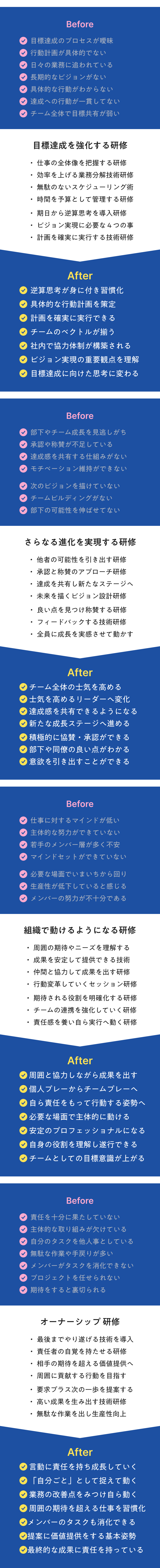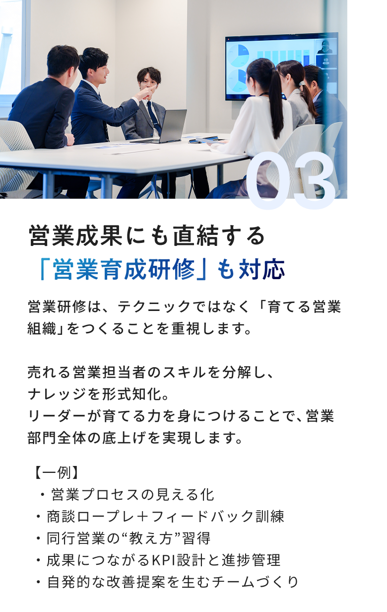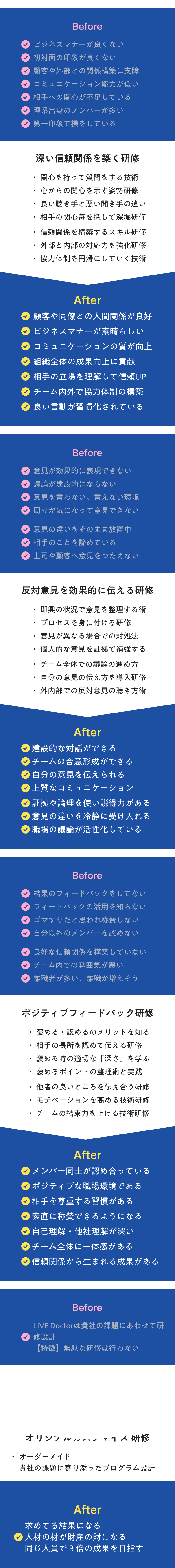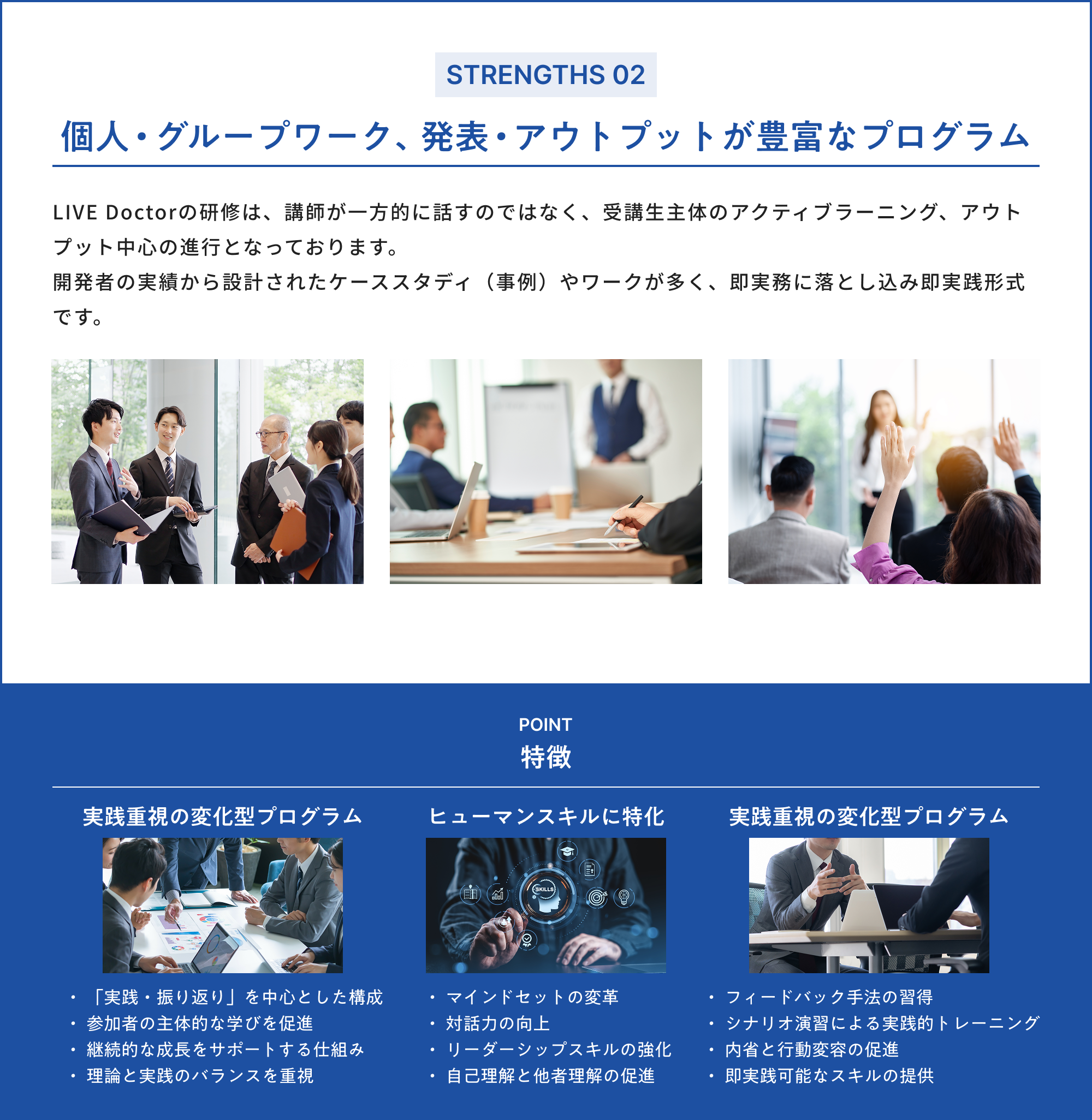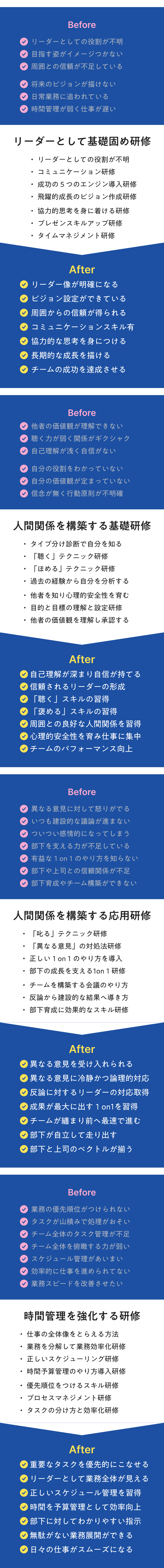 私どもの研修は、「人の心を大切にする」という信念に基づいています。人間関係の本質を核とした確かなロードマップに沿って実施し、「心の幸せと業績向上を必ず両立させる」再現性の高いメソッドをご提供します。御社の社員様一人ひとりの可能性を開花させることに全力を注ぎます。