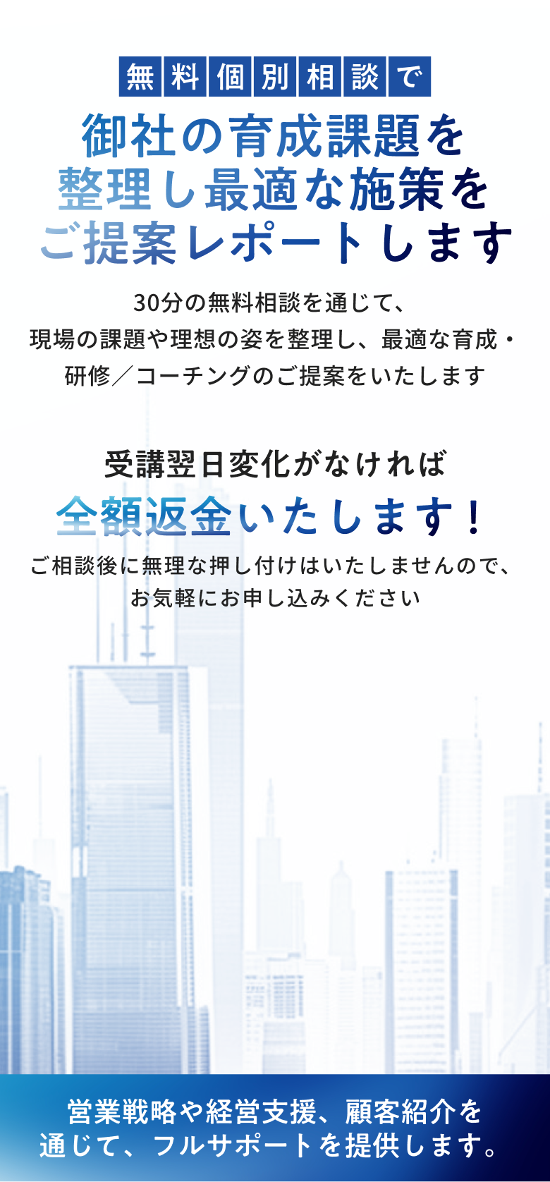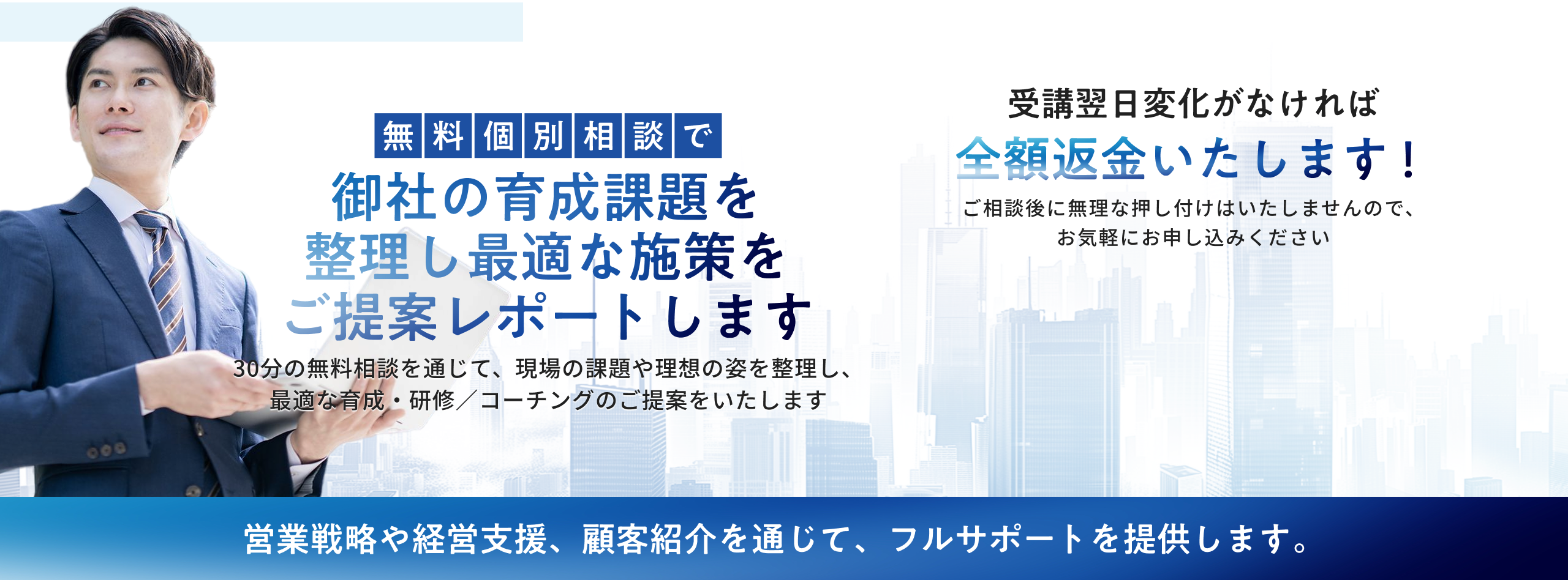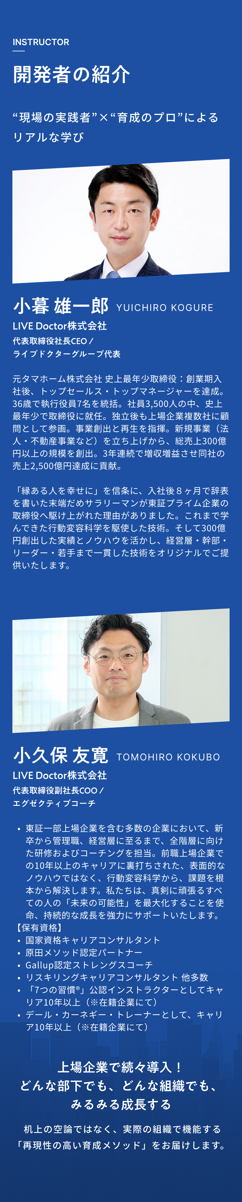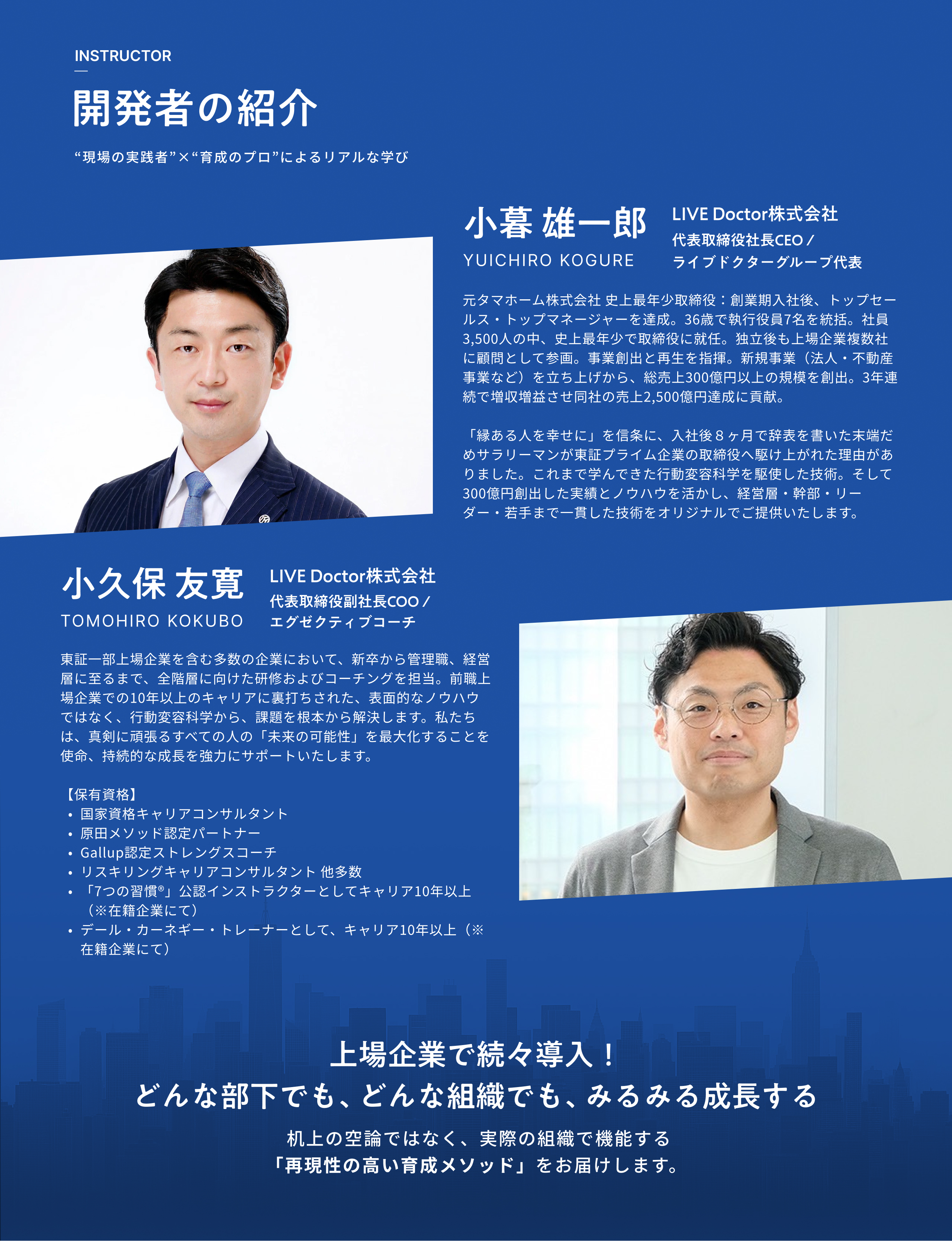 本プログラムは、代表小暮と小久保の両名が歩んできたキャリアに基づき構築されています。新卒時の苦い経験から史上最年少取締役へと昇進し、最高益を叩き出した小暮の実績と、10年以上のキャリアを持つプロトレーナー小久保の指導力。 この両輪により「人は必ず変われる」という信念を具現化しました。本質を捉えた再現性の高いロードマップを、余すことなくご提供いたします。