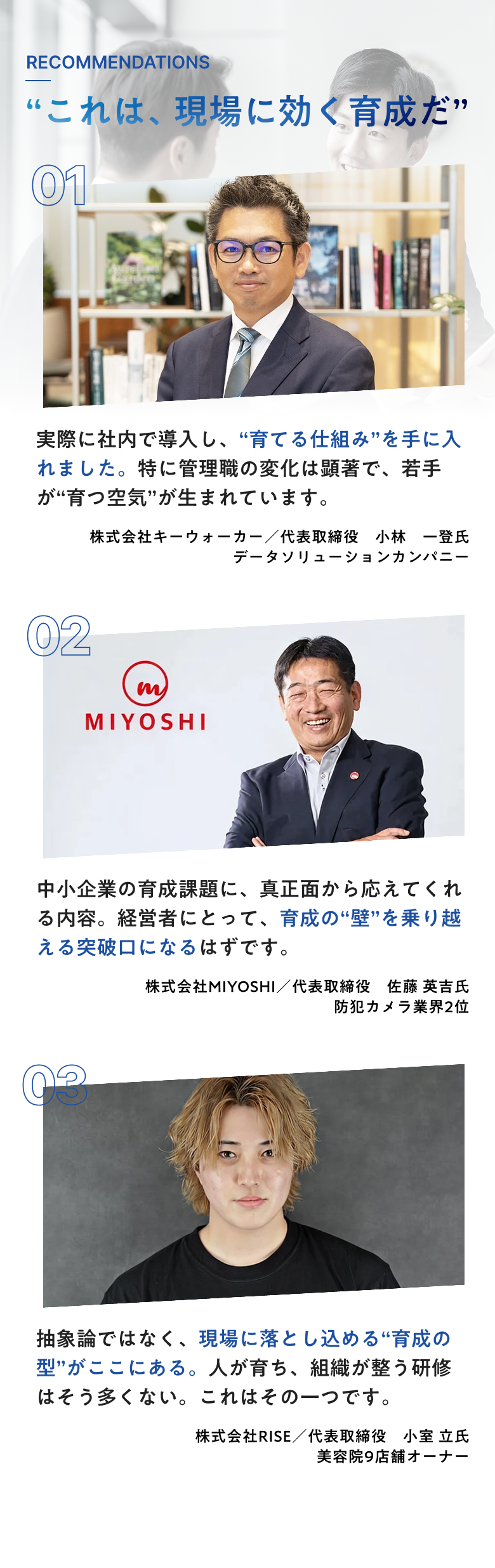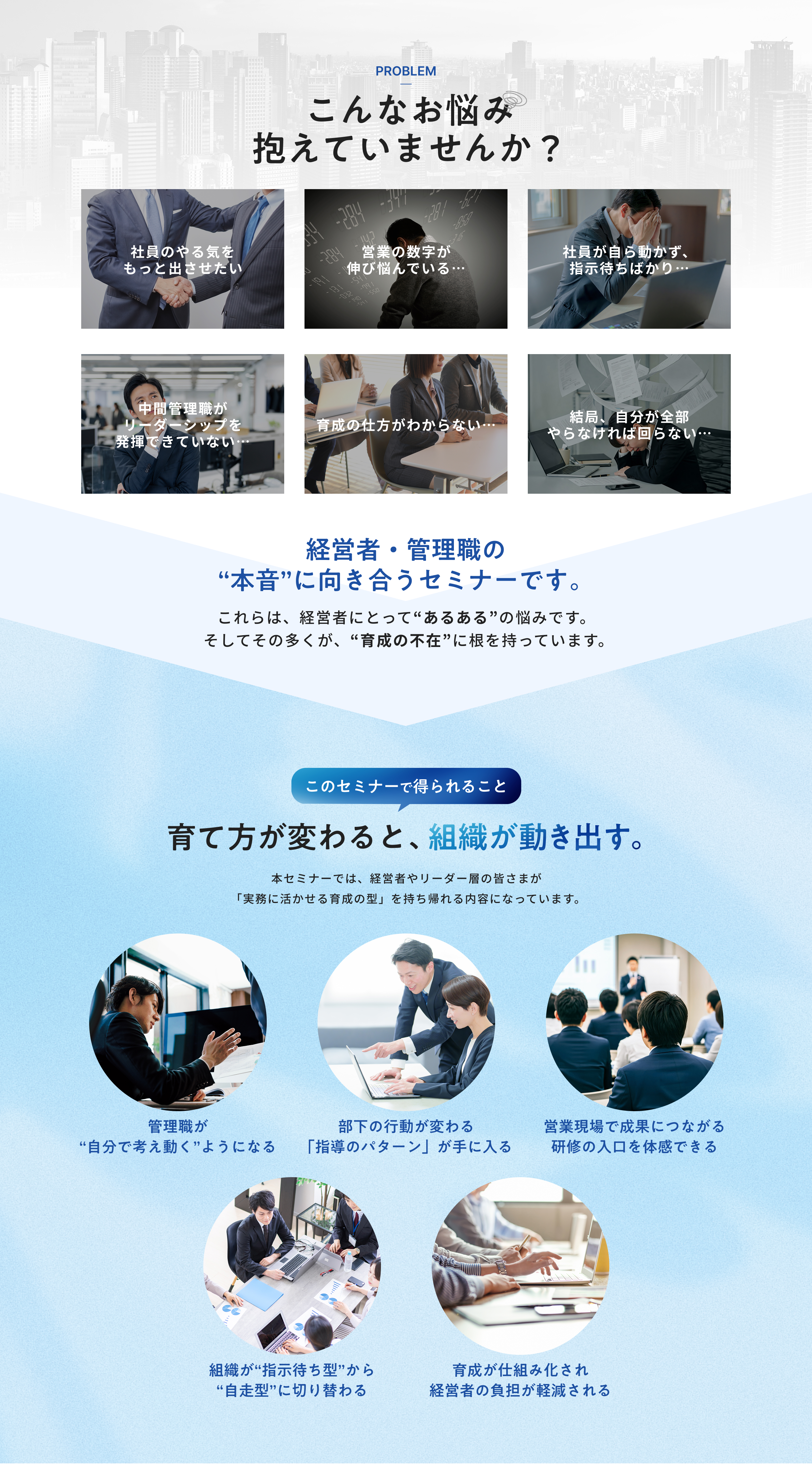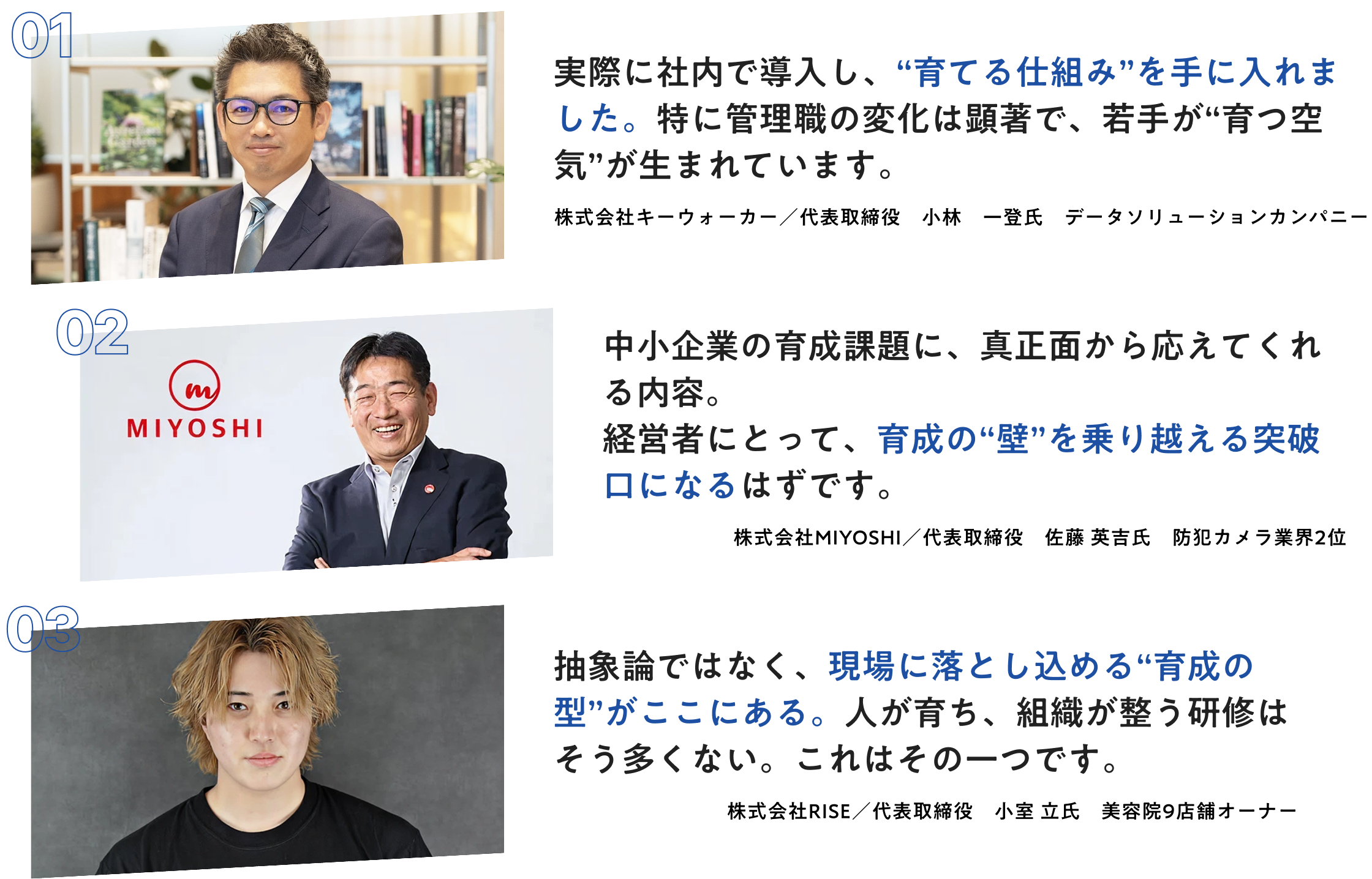 本プログラムは、代表小暮と小久保の両名が歩んできたキャリアに基づき構築されています。新卒時の苦い経験から史上最年少取締役へと昇進し、最高益を叩き出した小暮の実績と、10年以上のキャリアを持つプロトレーナー小久保の指導力。 この両輪により「人は必ず変われる」という信念を具現化しました。本質を捉えた再現性の高いロードマップを、余すことなくご提供いたします。