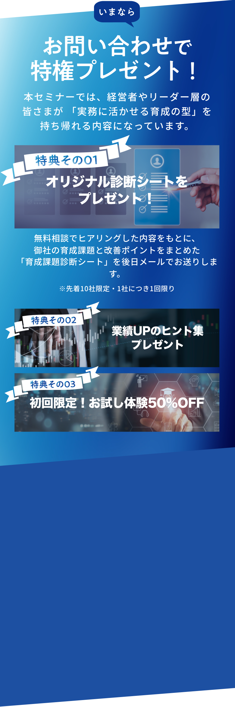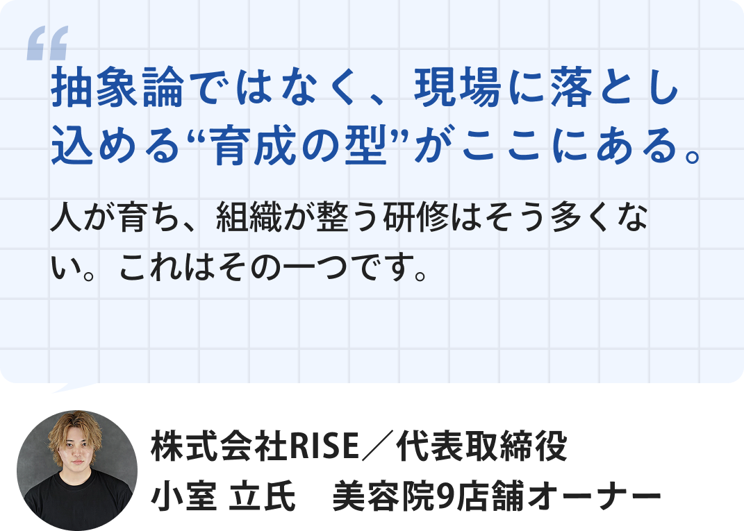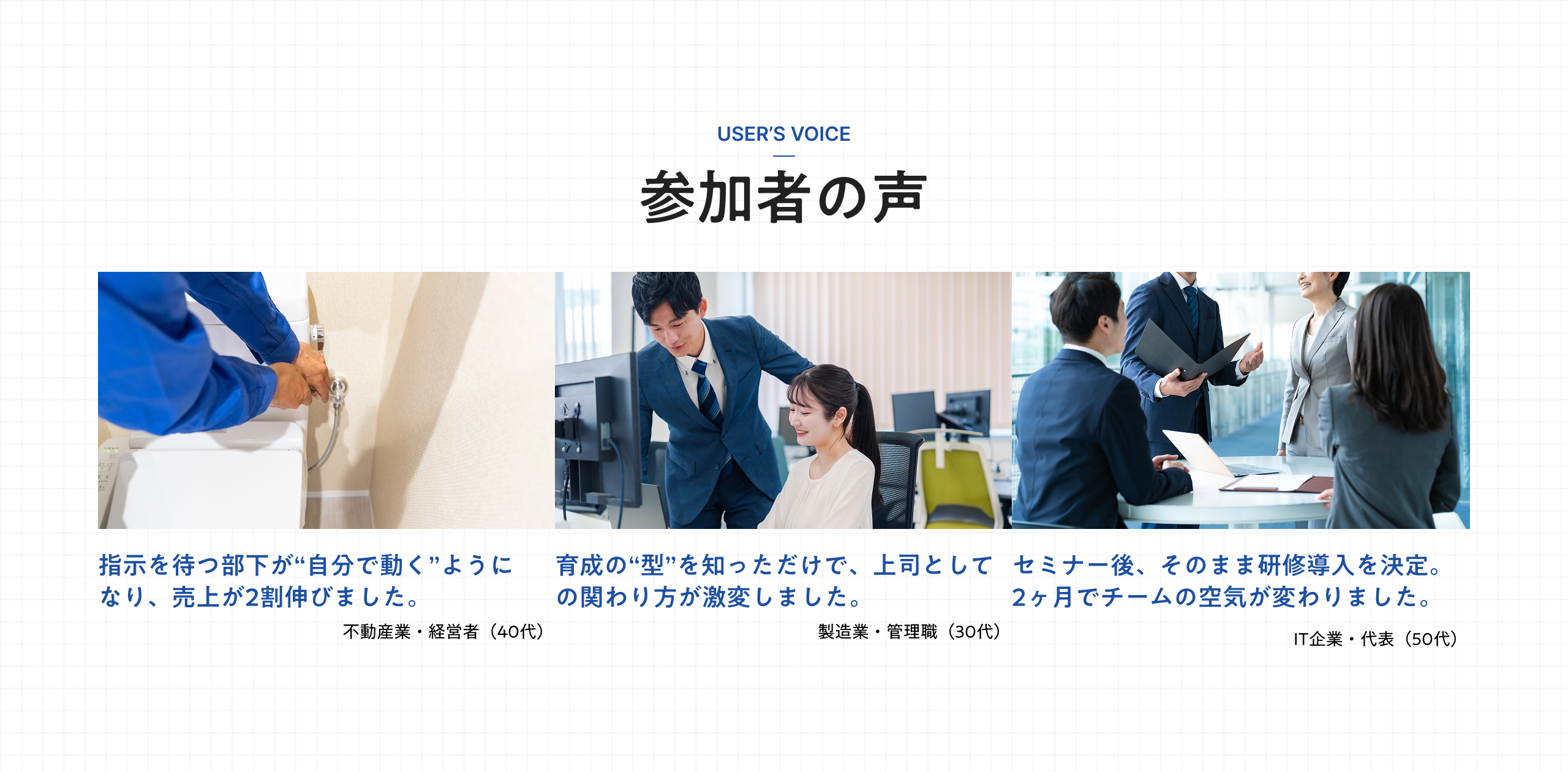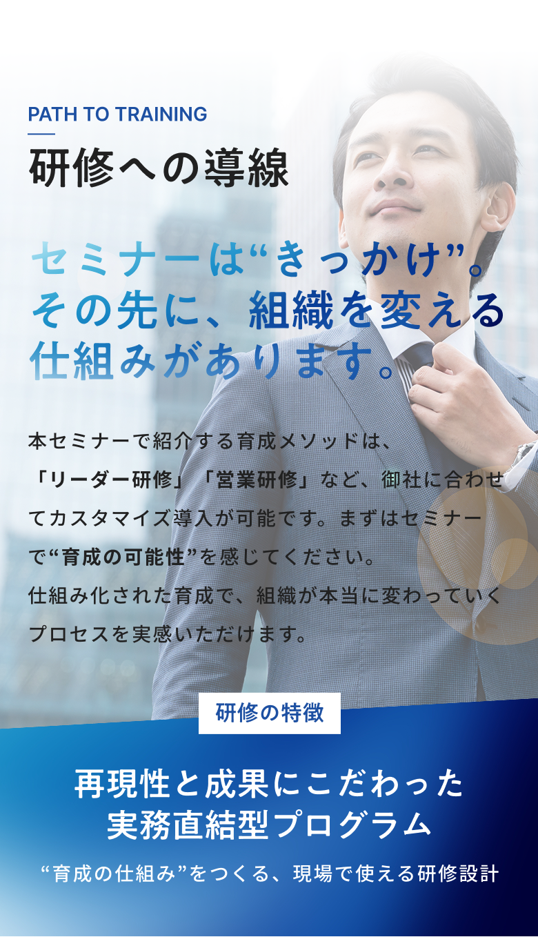 本プログラムは、代表小暮と小久保の両名が歩んできたキャリアに基づき構築されています。新卒時の苦い経験から史上最年少取締役へと昇進し、最高益を叩き出した小暮の実績と、10年以上のキャリアを持つプロトレーナー小久保の指導力。 この両輪により「人は必ず変われる」という信念を具現化しました。本質を捉えた再現性の高いロードマップを、余すことなくご提供いたします。