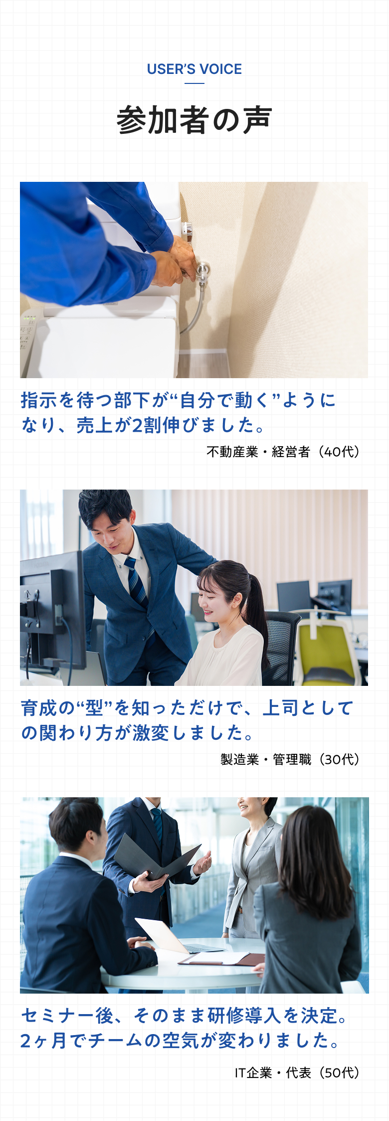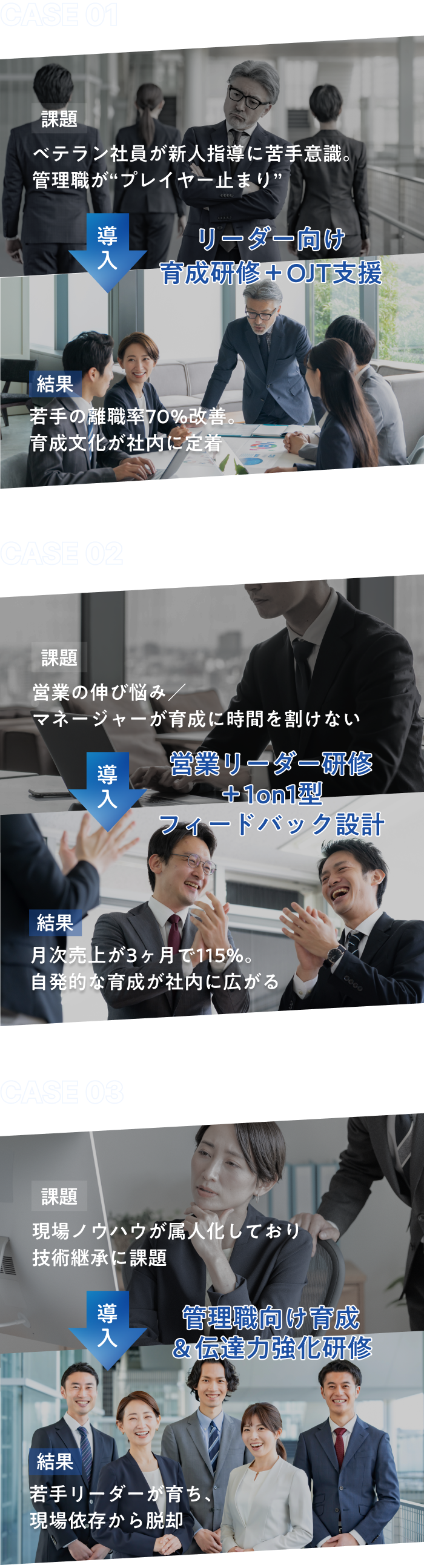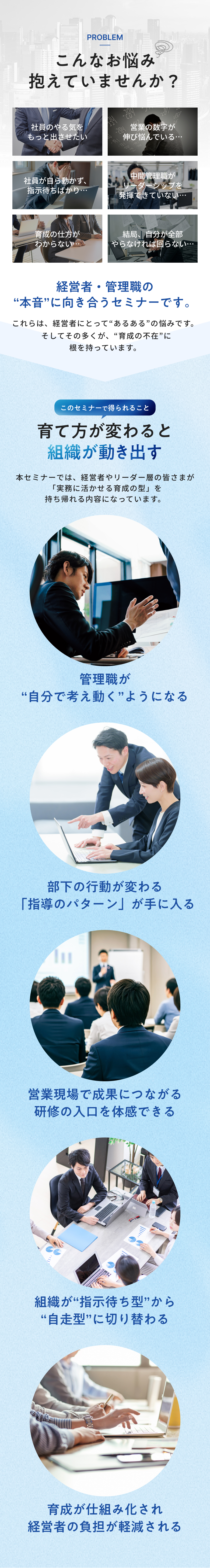 特に、「部下を活かし切れていない上司の変革」、リーダーシップの質の向上、社員のエンゲージメントと定着率の改善、そして組織全体の活力を高める業績向上に強みがあります。貴社の「仕事で誰も壊れない」組織づくりを、心から支援いたします。